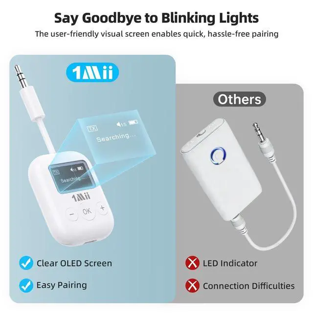 • New User-friendly Screen Unlike typical transmitters with confusing blinking lights, the 1Mii Bluetooth transmitter features an easy-to-read screen, making setup and managing connections a breeze. The perfect gift for parents unfamiliar with complicated electronics