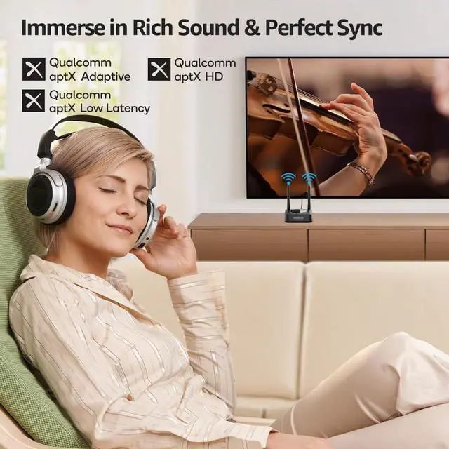 NOTE: This is a Bluetooth transmitter only, not a receiver ^^ Readable Pairing by Screen Display1Mii B06TX+ is a great upgrade from old generation, the pairing is simple and easy to understand, especially suitable for middle-aged and elderly people ^^ Share TV, Double HappinessThis Bluetooth transmitter hasdual-link function that allows 2 Bluetooth headphones/speakers to connect at the same time. Audio can play through both Bluetooth devices simultaneously. Enjoy movie without bothering others ^^ Low Latency, Crystal SoundaptX Low Latency technology eliminate audio delay, brings perfect synchronization of sound and picture. To reach "LL" function of B06TX+, be sure to use a Bluetooth headphone or speaker also support aptX Low Latency tech ^^ Flexible Connection1Mii B06TX+ Bluetooth transmitter for TV is designed with AUX 3.5 mm, RCA, Optical, Coaxial audio inputs which brings you the most flexible and quality connection. It is compatible with 99% TV, Projector, Computer, etc