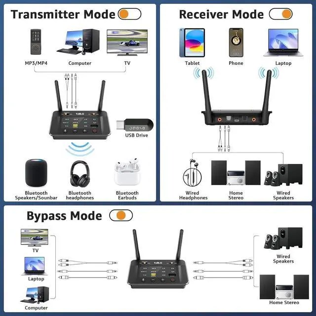 Versatile Transmitter/ReceiverThe 1Mii B03S Bluetooth Transmitter/Receiver elevates your audio setup with the latest Bluetooth 5.3 technology. In TX mode, it streams audio from your TV, DVD player, or other devices to Bluetooth headphones or speakers for a wireless experience. In RX mode, it lets you stream music from your phone, tablet, or laptop to your wired stereo system, turning your traditional setup into a modern, Bluetooth-enabled system ^^ Crystal-Clear Sound, Low LatencyThe B03S offers superb audio quality with support for aptX codecs. Enjoy seamless audio-video sync with aptX Low Latency or aptX Adaptive, and high-res sound with aptX HD.