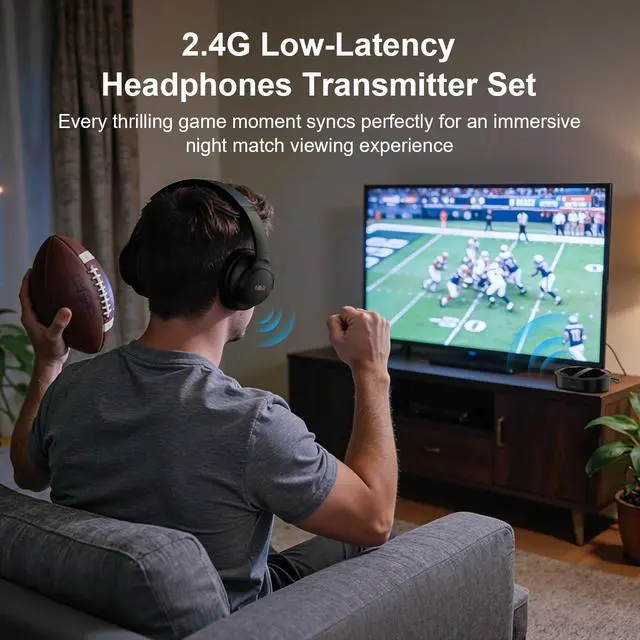 Plug and Play, Enjoy Hi-Fi Audio Simply connect the audio cables to the transmitter and TV, then power on all devices, and you're ready to enjoy an immersive TV viewing experience with these wireless TV headphones. Say goodbye to muffled TV speakers. With our headphones, every detail resonatesfrom the protagonist's whispered words and tense breaths to the soaring soundtrack of victory. You don't just hear the emotionyou feel it. ^^ Ultra 2.4G Low Latency Audio With these wireless headphones for tv watching, experience less than 40ms ultra-low latencyso the sound always matches the action.