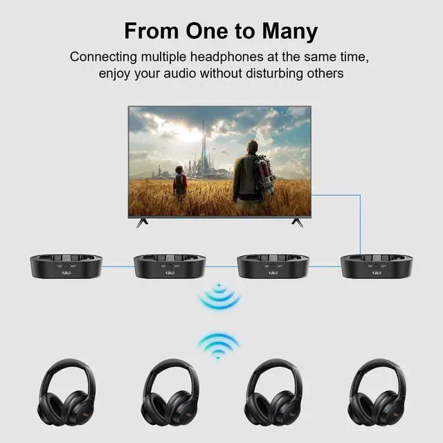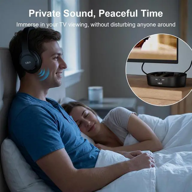 Whether it's the roar of a goal or the crack of a bat, you'll hear it in real time. Plus, with up to 100ft of wireless range, you can grab a snack or jump up to cheer without a single dropout. Total freedom, total immersion. ^^ Your Exclusive Home Theater 1Mii wireless TV headphones with transmitter creates a private home theater experienceideal for midnight viewing. Immerse yourself in the movie while your family sleeps soundly, undisturbed. Specially designed as TV headphones wireless for seniors and the hearing-impaired, they feature independent volume control for clearer dialogue.