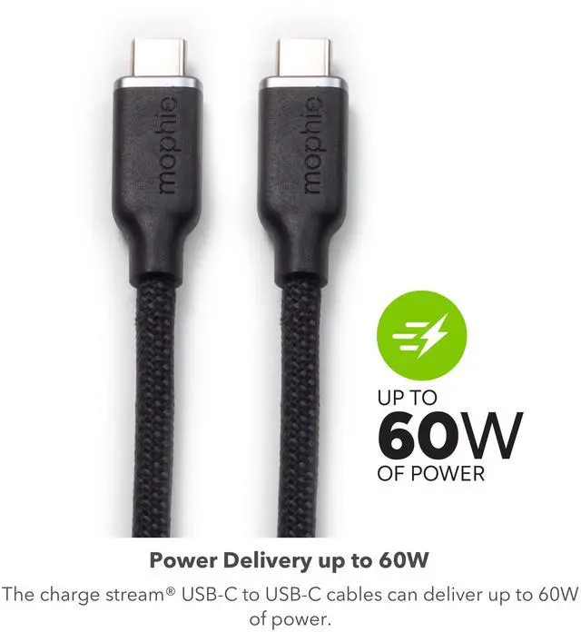 Discover a fusion of durability, flexibility, and performance with the Mophie charge stream USB-C to USB-C cable. Crafted for daily rigor, its heavy-duty braided construction is designed to withstand 30, 000 bends, setting new industry benchmarks. At its core, the proprietary Enduraflex silicone ensures the cable remains kink-free, offering a tactile feel that is as premium as its design. With 60W Power Delivery, charging becomes not just swift, but also efficient, while the fortified attachment points showcase Mophie's commitment to quality and longevity. Recognizing the needs of the contemporary user, we've added a thoughtfully designed cable strap, ensuring that whether at home, office, or on an adventure, your cable remains tangle-free and ready for action.
