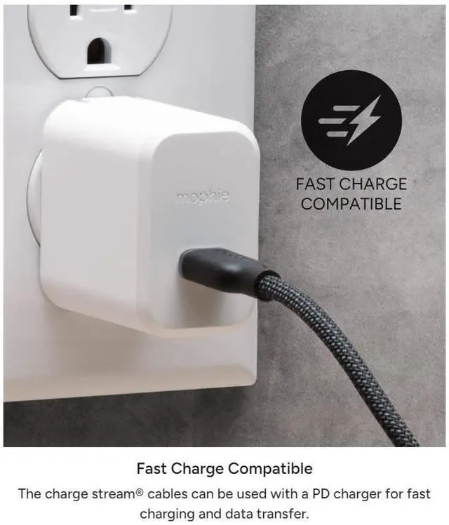Crafted for reliability and robustness, the Mophie charge stream USB-A to Lightning cable stands out in the realm of charging solutions. With its heavy-duty braided design tested to resist 30, 000 bends, the cable ensures long-term durability, making fraying and breakage concerns of the past. At its core, the soft pliable Enduraflex silicone provides unmatched flexibility, promising a kink-free user experience. Moreover, reinforced strain relief points guarantee a prolonged lifespan even with constant use. Designed with fast charging in mind, the cable is adept at Power Delivery up to 12W, ensuring swift and efficient energy transfer.