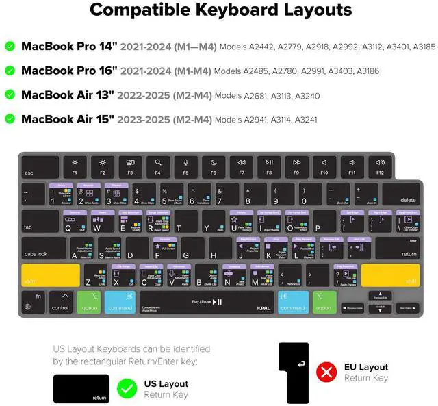 Compatible with US English keyboards for 2021 or Newer MacBook Pro 14" (A2442/A2779/A2918/A2992/A3112/A3401/A3185) and MacBook Pro 16" (A2485/A2780/2991/A3403/A3186) as well as the 2022 or Newer MacBook Air 13" (A2681/A3113/A3240) and 2023 or Newer MacBook Air 15" (A2941