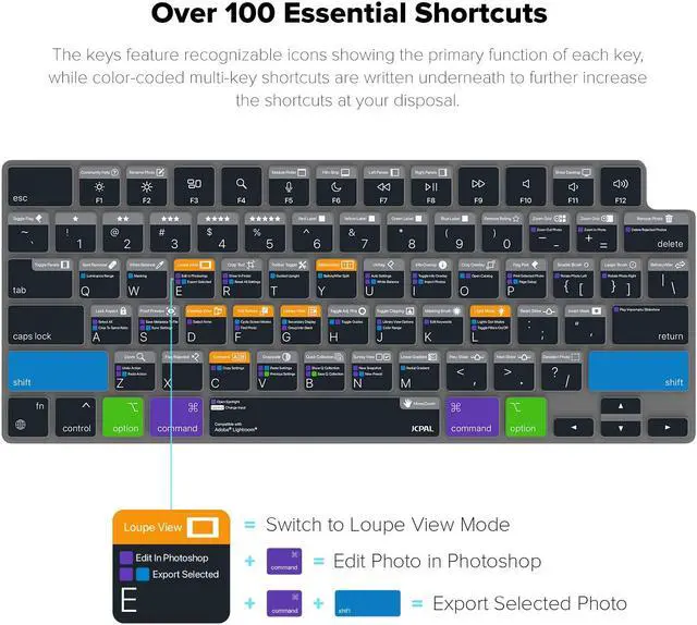 Improve your muscle memory with up to 3 shortcuts per key. Featuring recognizable icons for the primary key function as well as color-coded multi-key shortcuts.