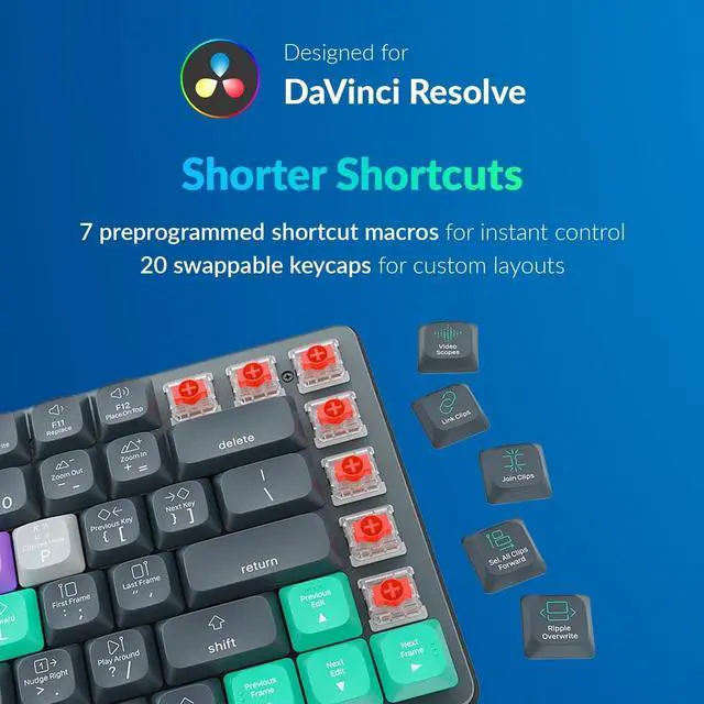 FULLY CUSTOMIZABLE SHORTCUT KEYS: Reassign any key to suit your workflow or use one of the 20 interchangeable shortcut keycaps for your most used commands. Save the profile directly to the keyboard, no software required. ^^