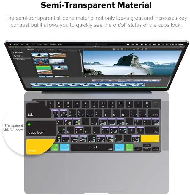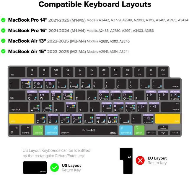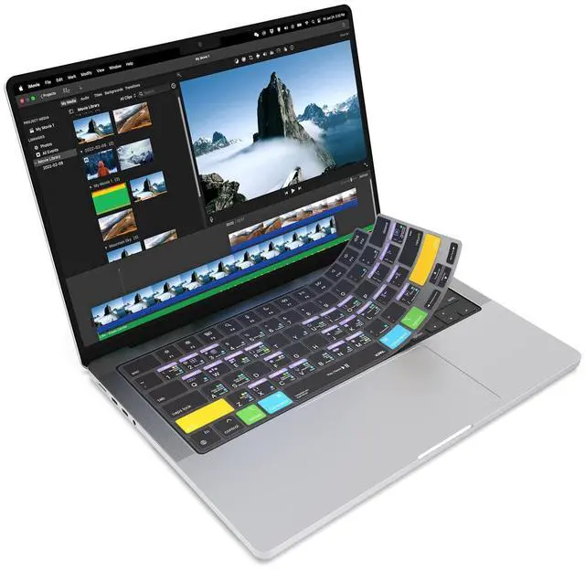 Vivid screen printed design with a guide to over 70 essential shortcuts for iMovie. Printed directly on the ultra-thin 0.3 mm silicone keyboard protector. ^^ Improve your muscle memory with up to 3 shortcuts per key. Featuring recognizable icons for the primary key function as well as color-coded multi-key shortcuts. ^^ Designed by JCPal in Vancouver, Canada for the latest version of iMovie. Protects your Apple Laptop from dust and liquid spills and can be washed without affecting the fit. ^^ The transparent black silicone keyboard cover is precisely form fitted for the new Apple MacBook Air M2/M3/M4 13 inch and MacBook Air 15 inch as well as MacBook Pro 14 M1/M2/M3/M4/M5 and MacBook Pro 16 M1/M2/M3/M4 Models.
