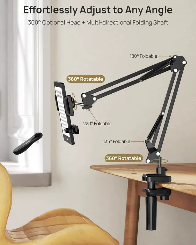 360deg Adjustable, Rock-Solid Support: Clamp this kindle bed stand with remote page turner or bedside kindl