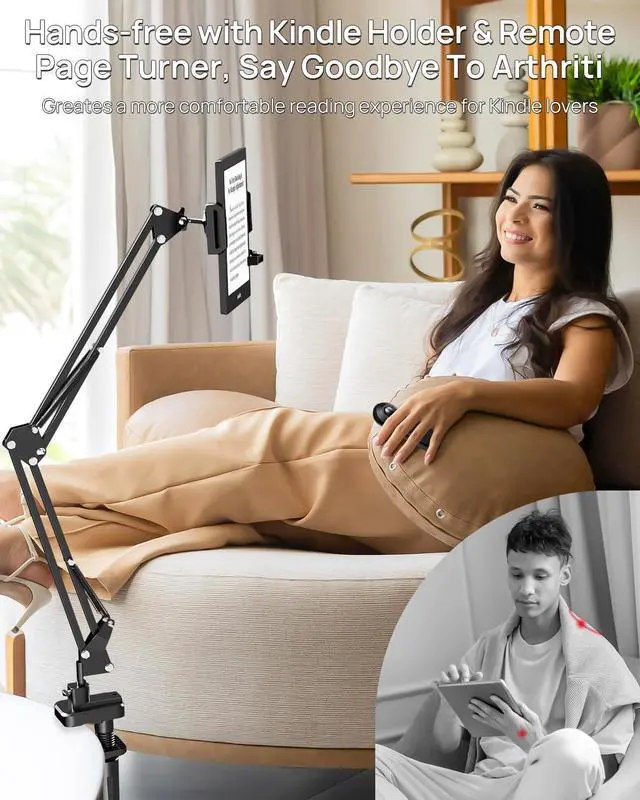 Experience True Hands-Free Reading: This hands free Kindle holder with remote page turner and stand frees your hands completely. Effortlessly adjust the metal arm, click the wireless page turner clicker, and immerse in every chapter without lifting a finger