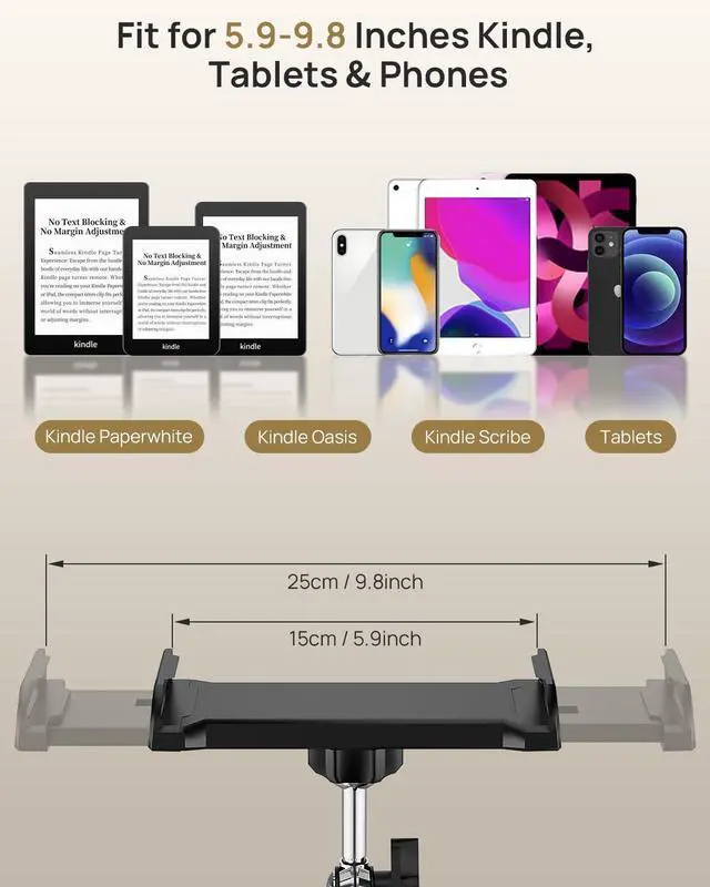 Universal 5.9''-9.8'' Compatibility: Whether you need a kindle holder for reading in bed, a kindle stand with remote page turner, or a kindle arm for reading on your desk, this mount fits all devices from 5.9'' to 9.8''