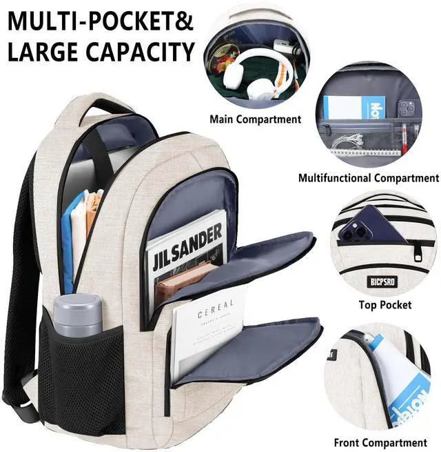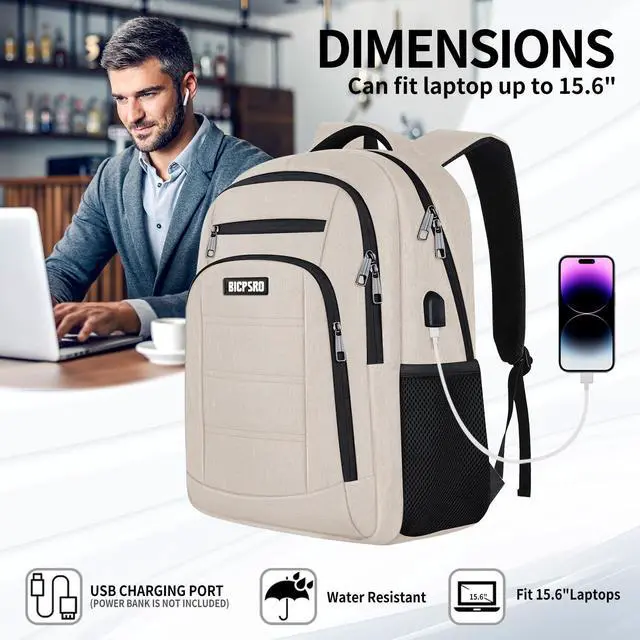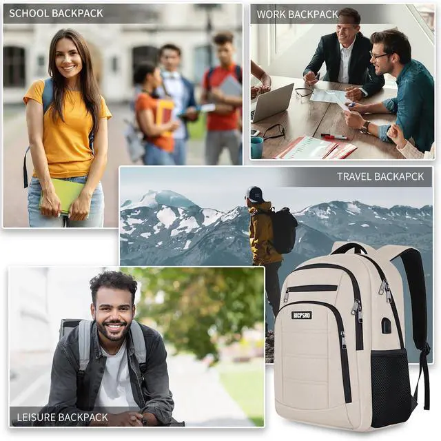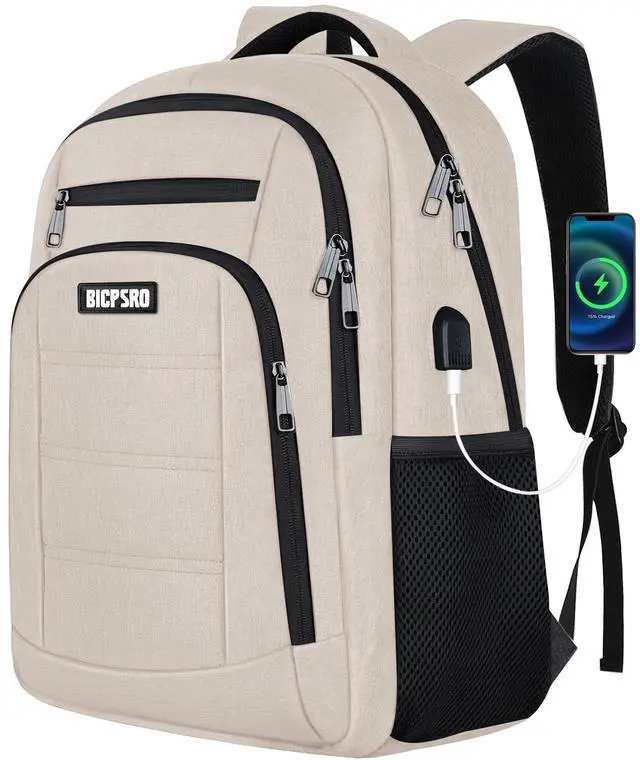 Beige Backpack for Women, School Backpack for Girls Teens Boys , Work Business Back pack with USB Charging Port,Water Resistant College Computer Bookbag Fits 15.6 Inch Laptop,Back Pack,Mochilas