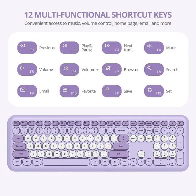 Full Size 110-Key Retro Design: This charming purple typewriter-style keyboard features a full 110-key layout with a numeric keypad. The noise-canceling keys and retro round concave keycaps provide a comfortable typing experience reminiscent of old typewriters, reducing hand fatigue during extended use.