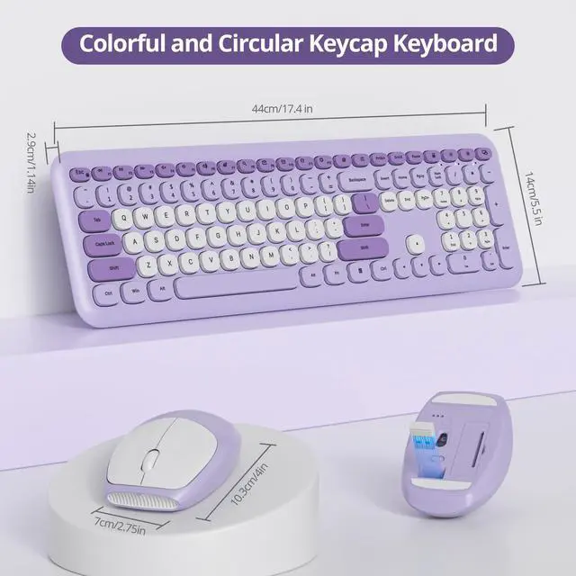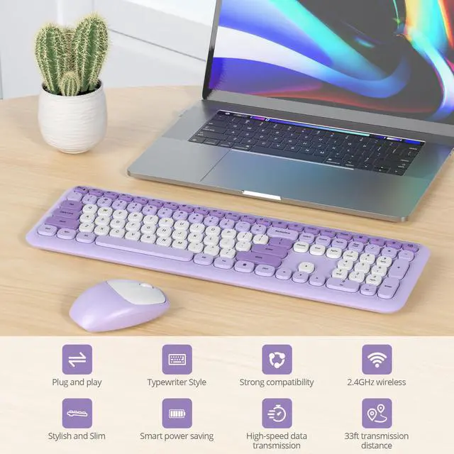 SbocKeeb Wireless Typewriter Keyboard and Mouse Combo Retro 104 Key Full Size Office Set Purple with Silent Round Keycaps, Ideal for Laptop and Desktop PCs, Cute Design Keyboard (Purple White)