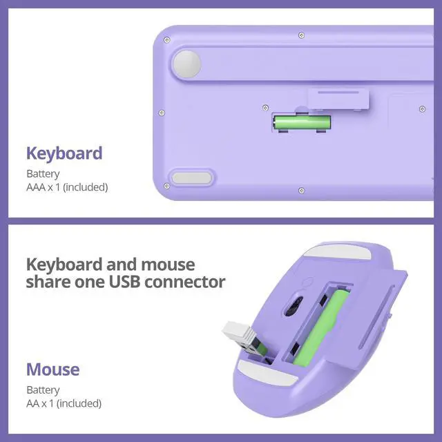 Smart Auto Power-Saving: Enhance battery life with the auto power-saving feature. The keyboard, powered by a single AAA battery, and the mouse, powered by a single AA battery (both included), will enter sleep mode after 5 minutes of inactivity. Simply press any key to wake up the devices.