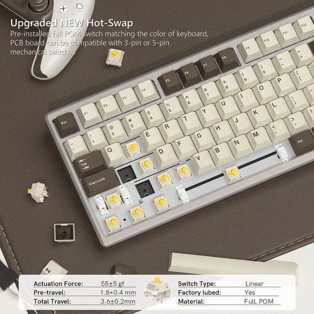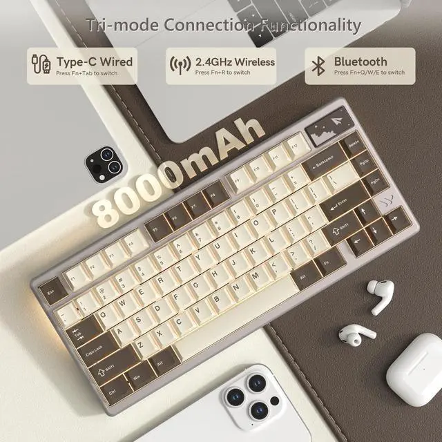 Tri-mode Connection Wireless Mechanical Keyboard & 8000mAh Battery: SK71 Pro offers flexible connectivity with Bluetooth, 2.4G wireless, or Type-C for precise performance. Simply toggle the "ON" switch under the badge during your first wireless connection, and you're set for life! In wireless mode, the built-in battery protection keeps the keyboard in low-power standby when not in use, ensuring longer battery life. You can also easily switch connection types with simple shortcut key combinations.