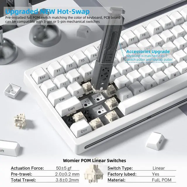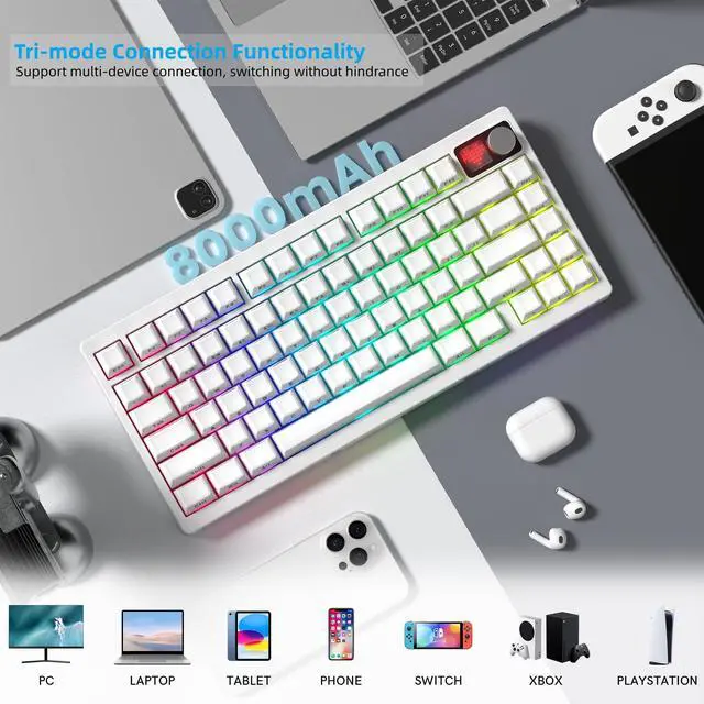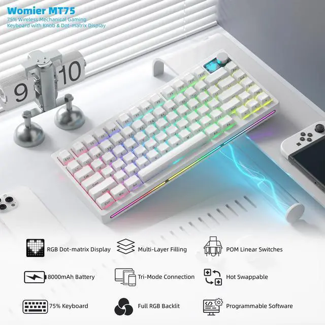 Battery: WOMIER MT75 wireless mechanical keyboard provides three connection methods, including BT 5.0, 2.4GH z wireless mode, and USB wired mode. It can be connected to up to five devices at the same time. The large 8000mAh battery ensures extended use, making this wireless keyboard ideal for productivity and gaming. ^^ Dynamic RGB Backlight & Programmable SoftwareRGB gaming keyboard has with 1680 million colors. A variety of dynamic RGB effects, monochrome, full-color modes, and musical rhythm mode, the playability is doubled, so that you can experience the unlimited fun of RGB. You can customize RGB modes and colors through software. The mechanical gaming keyboard supports programming software, you can easily redefine your keyboard. ^^ Hot-Swappable Keyboard & Full POM SwitchesHot swap gasket mount keyboard. Have fun customizing the acoustic performance and typing feeling on your own preference. Hot-swap PCB allows you to replace 3 pins/5 pins switches. The keyboard is pre-installed with high-quality POM linear switch, which has advantages in use and design, provide you with a smoother typing experience. Keyboard also It is compatible with Win and Mac systems.
