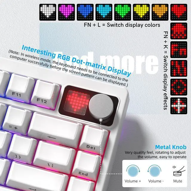Meet MT75 75% Wireless Mechanical Gaming KeyboardKeyboard with custom dot-matrix display is interesting and beautiful, which will bring you wireless fun, and the metal knob makes you easy to operate in use. Practical compact layout makes the desktop simple, where you' re working, gaming, or creating, this versatile wireless keyboard adaptations to all your needs. Beneath its strict design lies a typing experience like no other. ^^ Custom Wireless Bluetooth Keyboard with