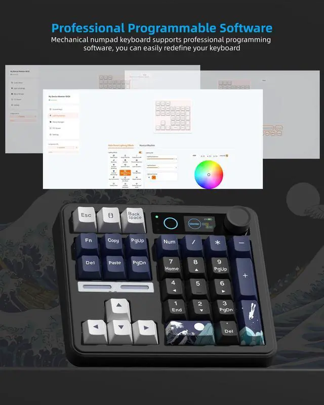 • Wireless Multi-function 30-key Numeric keypad with Multimedia Screen and Knob30-key kanagawa mechanical numpad with fully Programmable Keys, you can remap your numpad by your willing with NumLock/ESC/FN/Delete/Copy/Paste/Pgup/Pgdn and a shortcut key which can open the computer calculator directly. This number keypad is very easy to use.
