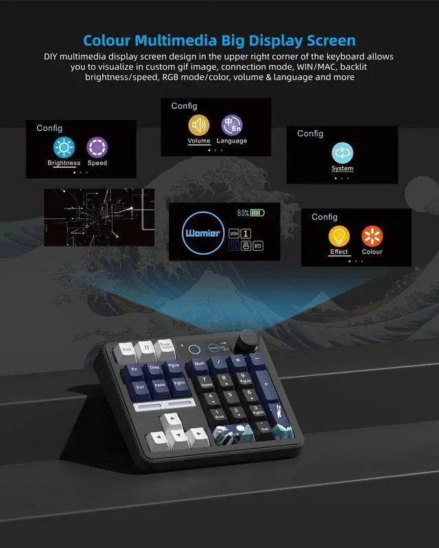 Wireless Multi-function 30-key Numeric keypad with Multimedia Screen and Knob30-key kanagawa mechanical numpad with fully Programmable Keys, you can remap your numpad by your willing with NumLock/ESC/FN/Delete/Copy/Paste/Pgup/Pgdn and a shortcut key which can open the computer calculator directly. This number keypad is very easy to use. ^^ Tri-mode Wireless Mini Keyboard & 3000mAh BatteryWork with Bluetooth 5.0, 2.4GH z, USB-C wired connection. Womier SK30 rechargeable numpad is equipped with a 3000mAh battery ensures extended use can be connected to PC, laptop, tablet, gaming console and mobile phone to meet the needs of work, game and study.