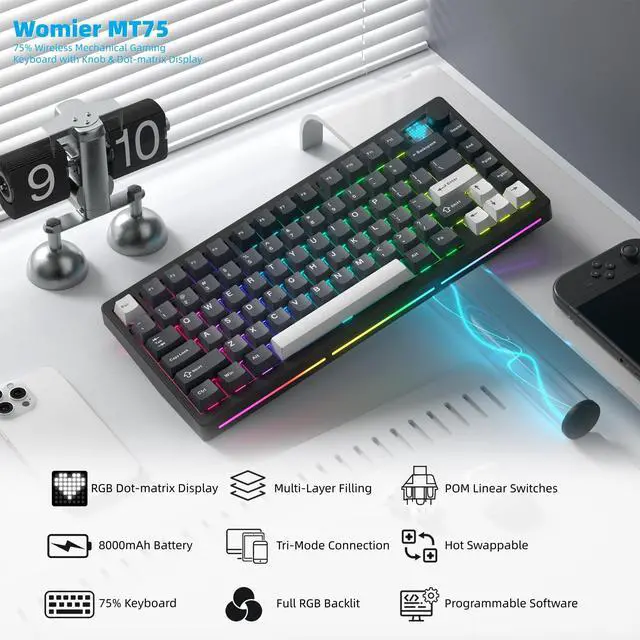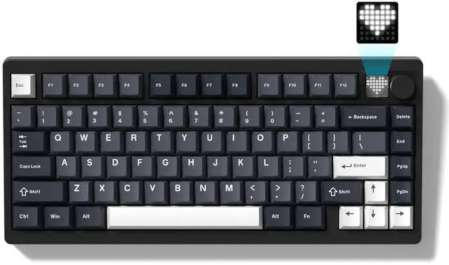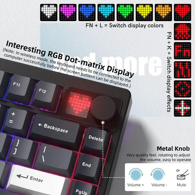 Meet MT75 75% Wireless Mechanical Gaming KeyboardKeyboard with custom dot-matrix display is interesting and beautiful, which will bring you wireless fun, and the metal knob makes you easy to operate in use. Practical compact layout makes the desktop simple, where you' re working, gaming, or creating, this versatile wireless keyboard adaptations to all your needs. Beneath its strict design lies a typing experience like no other. ^^ Custom Wireless Bluetooth Keyboard with