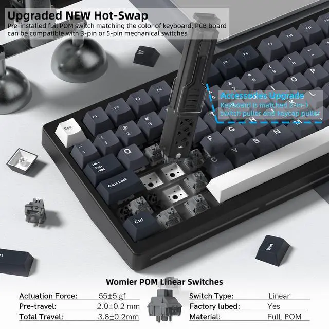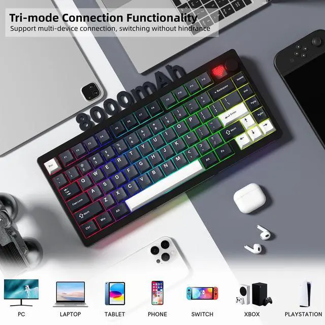 Battery: WOMIER MT75 wireless mechanical keyboard provides three connection methods, including BT 5.0, 2.4GH z wireless mode, and USB wired mode. It can be connected to up to five devices at the same time. The large 8000mAh battery ensures extended use, making this wireless keyboard ideal for productivity and gaming. ^^ Dynamic RGB Backlight & Programmable SoftwareRGB gaming keyboard has with 1680 million colors. A variety of dynamic RGB effects, monochrome, full-color modes, and musical rhythm mode, the playability is doubled, so that you can experience the unlimited fun of RGB. You can customize RGB modes and colors through software. The mechanical gaming keyboard supports programming software, you can easily redefine your keyboard. ^^ Hot-Swappable Keyboard & Full POM SwitchesHot swap gasket mount keyboard. Have fun customizing the acoustic performance and typing feeling on your own preference. Hot-swap PCB allows you to replace 3 pins/5 pins switches. The keyboard is pre-installed with high-quality POM linear switch, which has advantages in use and design, provide you with a smoother typing experience. Keyboard also It is compatible with Win and Mac systems.