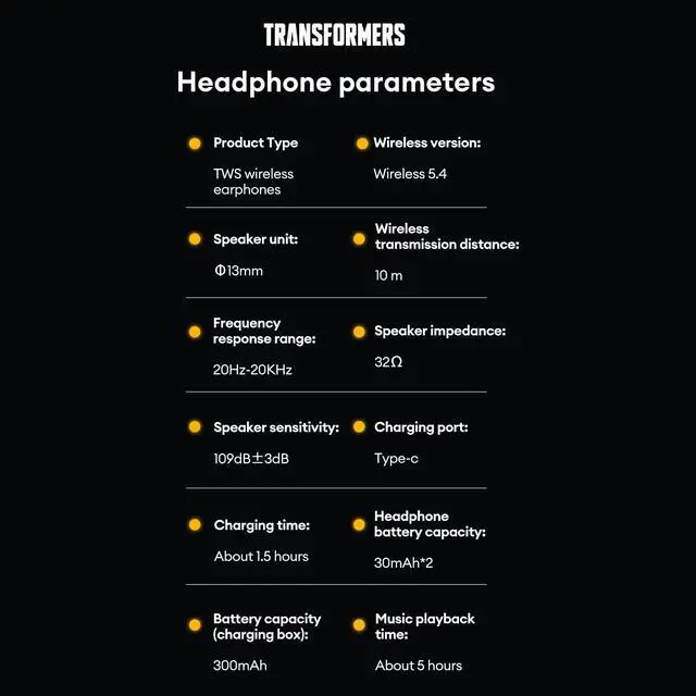 Low Latency Gaming Mode Enjoy lag-free, real-time audio with Bluetooth 5.4 technology, perfect for mobile gaming, videos, and calls. ^^ HiFi Music Mode Switch to Music Mode for rich stereo sound with deep bass, clear mids, and crisp highs for an immersive listening experience. ^^ Long Battery Life Stay powered all day with extended playtime and a Transformers-themed charging case that provides quick, portable charging. ^^ Built-in Microphone & Noise Cancelling Make crystal-clear calls with advanced noise reduction technology, ensuring your voice is always heard. ^^ Comfortable, Secure Fit Lightweight ergonomic design stays comfortable during gaming, workouts, and daily use, with touch controls for easy operation.