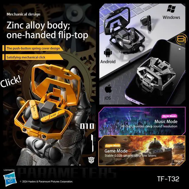 Experience next-level audio performance with the TRANSFORMERS TF-T32 Wireless Bluetooth 5.4 Earbuds, engineered with a premium Zinc Alloy Armor Charging Case and powered by Xinghuan Machinery Cyberwind design technology. Built for music lovers, gamers, and everyday users, these true wireless earbuds combine style, durability, and cutting-edge sound. Featuring an advanced 13mm dynamic driver, the TF-T32 delivers ultra-clear highs, deep bass, and a rich 3D soundstage. Whether you're listening to music, watching videos, or taking calls, every detail is crisp and immersive. Enjoy lightning-fast connectivity with Bluetooth 5.4, offering a stable transmission range of up to 32 feet for uninterrupted audio.