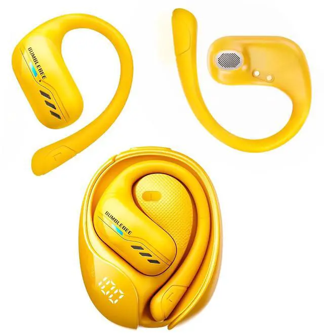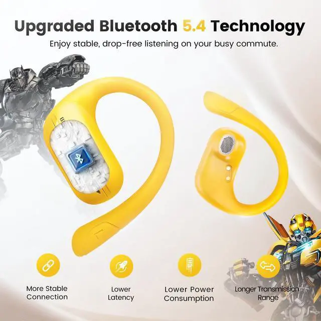 Transformers Open Ear Wireless Headphones Bluetooth 5.4 for Running & Workouts, Over The Ear Earbuds with IPX5 Waterproof Ear Hooks, Surround Sound, LED Display & Lanyard (Yellow - Bumblebee)