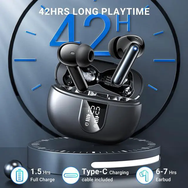 LED Display & 42 Hours Playtime: Separate LED wireless headphones battery display design, you can clearly see the charge level of each earbuds and cha