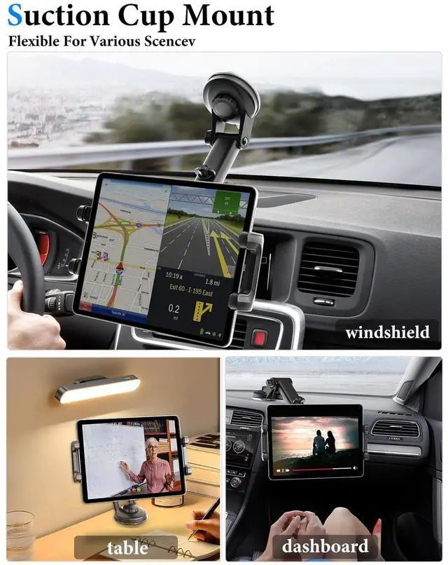 Multi-FunctionThis Dashboard Tablet Holder With the latest powerful suction cup and, this car phone mount could be installed on car dashboard, windshield securely, Desks, workbenches and other flat surfaces, Car Suction Cup Tablet Car Mount Suitable choice to most for the cars, pickup trucks, SUV, trucks, taxis, good assistant for Uber, Lyft drivers.