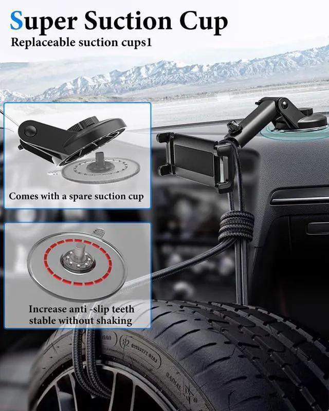 Super Powerful SuctionThis Suction Cup Tablet Car Mount The upgraded super viscous suction cup, Injection suction cup replaceable core(One more equipped)Increase the bone position at the bottom to effectively prevent the shaking position from strengthening the adsorption power super stable, Just rinse with water and dry to restore the adhesion of phone car holder, dashboard iPad holder for car Use Stepless knob lock techno logy to be more stable jin.