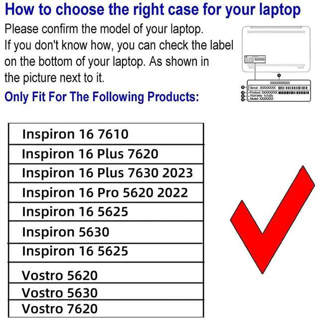 Compatible Models: This cover/case only fits for Dell Inspiron 16 Plus 7640 7630 7620 7610, Inspiron 16 Pro 5620 5630 5625, Vostro 5630 5620 7620 16 inch, cover dimensions(W X D X H): 36.3*26.4*2.8cm, not any other laptop.