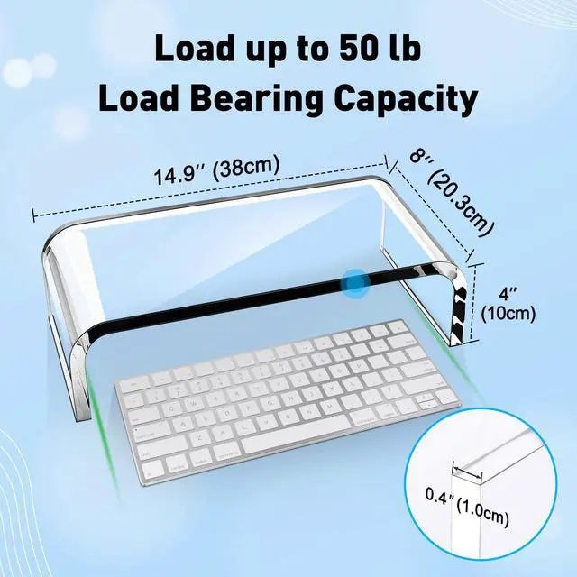 Professional-grade & Stability: Crafted from premium Class-A acrylic, our monitor stand surpasses both wood and metal alternatives. With thousands of tests conducted, upgraded and thickened acrylic monitor riser can supporting loads up to 50 pounds without bending or cracking.