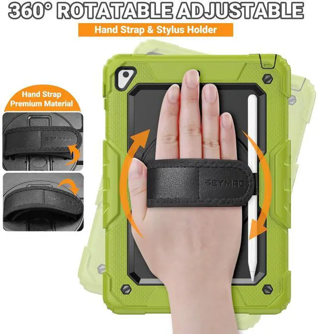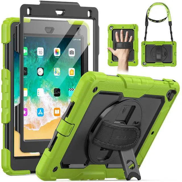 SEYMAC for iPad 6th/5th Generation Case 9.7 Inch, Full-Body Shockproof Heavy Duty Protective Case with Screen Protector, Rotating Stand/Hand/Shoulder Strap for iPad Air 2/ Pro 9.7, Green