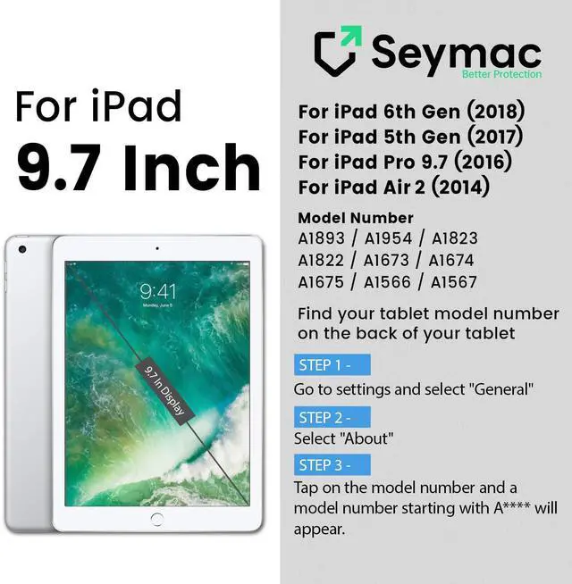 Compatibility: Only fits for iPad 6th/ 5th Generation/ Air 2/ Pro 9.7 9.7 inch (Model: A1893/ A1954/ A1822/ A1823/ A1673/ A1674/ A1675/ A1566/ A1567); please kindly check the model number on the back of your tablet (''Axxxx'') before purchase.