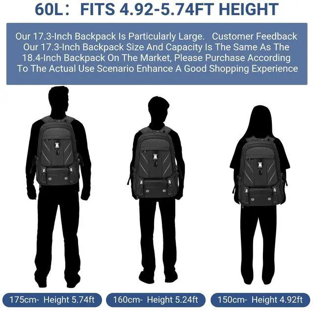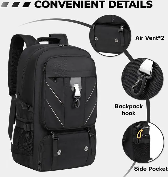 Large Capacity & SpaciousBanlole Extra-Large Travel Backpack comes with over 12 pockets, offering a spacious capacity of up to 60L. With its expandable design, you can unzip it for extra storage space, making it perfect for packing everything you need for a 3-7 day trip. This backpack is sized to meet the carry-on limits for most airlines, fitting easily in both overhead bins and under the seat. Its ideal for quick weekend getaways or business trips.