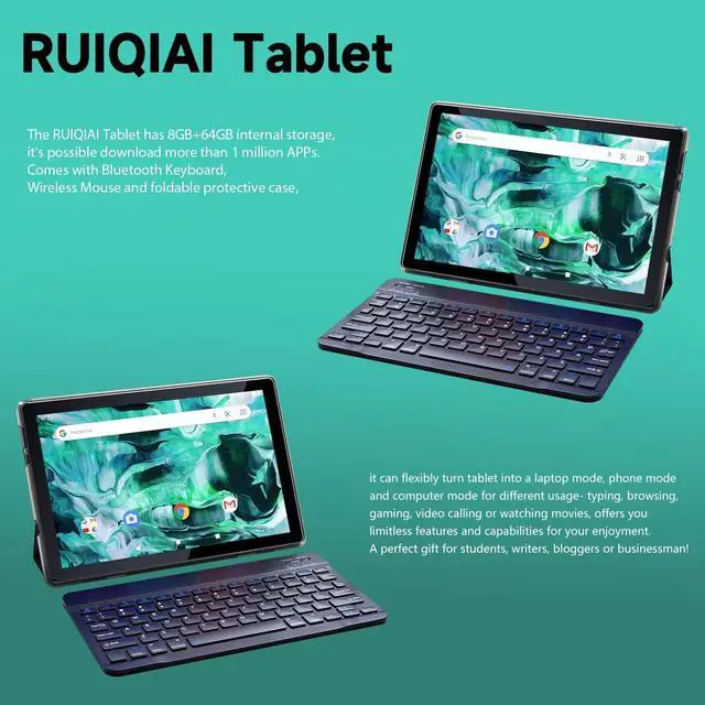 10.1'' HD Full View Display tabletsRUIQIAI Tab features a large 10.1-inch display that brings you into movies, shows, games and social media; an immersive on-screen experience - whether your family is watching a live stream or video chatting with a friend, the 10.1-inch screen delivers the best of what's going on at every moment.