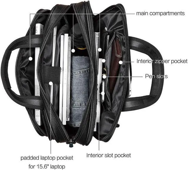 Organization & Storage: 2 main large compartments: back one includes 2 slot pocket, 2 pen holders, 1 zipper pocket and 1 large compartment; front one has 1 foam padded laptop compartment for 15.6 laptop and 1 main compartment. 2 front zipper pockets. 1 back zipper pocket with an exterior luggage strap. The laptop bag with multiple pockets offers roomy space for your laptop, mobile phone, Pad, pens, A4 file or books, clothes, umbrella and other daily things, and keep them well organized.