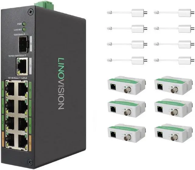 LINOVISION Industrial 8-Port EOC & POE Switch with 6pcs EOC Transmitters, Long Reach PoE Over Coax or UTP Cable, Simplified Wiring, Upgrading Analog System to IP Surveillance System