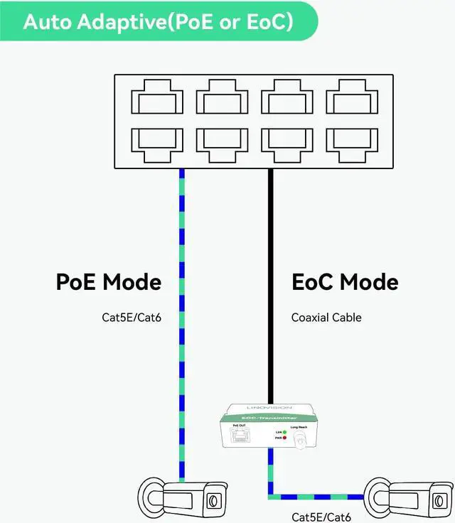 8-PORT POE&EOC HYBRID SWITCH Provides 8 PoE ports with built-in EOC Receiver. Each port is auto-adaptive to PoE mode or EoC(Ethernet over Coax) mode and you can use it flexibly. For example, you can use 4 ports in EoC mode and another 4 ports in PoE mode