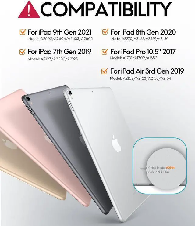 For iPad 9th/8th/7th Generation Case With Keyboard- Specially designed for iPad 9th Gen 10.2 inch 2021 (Model Number: A2602/A2603/A2604/A2605)/8th Gen 2020 (Model Number: A2270/A2428/A2429)/7th Gen 2019 (Model Number: A2197/A2200/A2198), for iPad Pro 10.5 2017(A1701/A1709/A1852), for iPad Air 3 Gen 10.5 2019(A2152/A2123/A2153/A2154). Please kindly check the model number starting with "A" on the back of iPad below the Apple logo before purchasing.