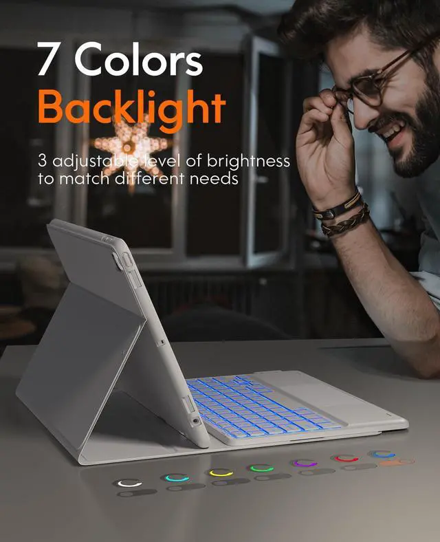 Backlit Keyboard For iPad 9th Generation- The keyboard case provides 7 color backlit options and 3 brightness modes, It has 3 brightness modes and breathing rate adjustments for more comfort. The spacious layout of the backlit keyboard is convenient for typing, and it is full of science and technology. You can read, browse and work freely anytime, anywhere.