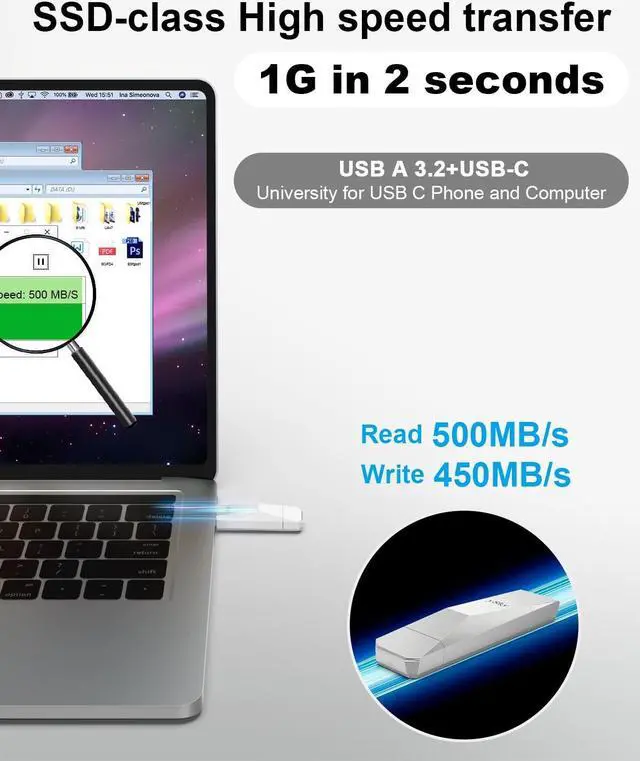 Super Fast Speed Read 500MB/s+ Write 450MB/s to Move Large Files Faster:USB-C memory Drive provides read speed as fast as 500MB/s. Write speed up to 450MB/s, 10 times faster than normal USB3.0, with Gen 2 USB 3.2 gives much better performance greatly improving efficiency and saving more time.