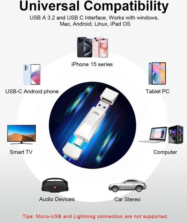 Wide Compatibility +Reliable Quality: ySky USB C flash drive universal for i-Phone 15/15 Plus/15 Pro/15 Pro Max/USB-C Android Phone, MacBook, Windows computer, desktop, notebook, car audio system, smart TV, Bluetooth speaker and More.