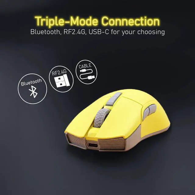 High Efficiency Triple Mode Gaming Mouse 2.4G/Bluetooth/detachable USB-C cable wired mode for easy recharging and flexibility in connecting to a computer. Lightweight design, only 66 grams, to alleviate the burden on the wrist during gameplay.