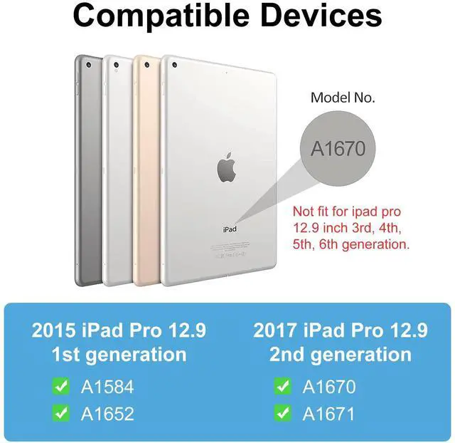 Compatibility: Only Fit for iPad Pro 12.9 2017 2nd Generation and 2015 1st Generation, old model: A1670/A1671/A1584/A1652. Please turn over your iPad check it before purchase. (Not fit for ipad pro 12.9" 2018 release or newer)