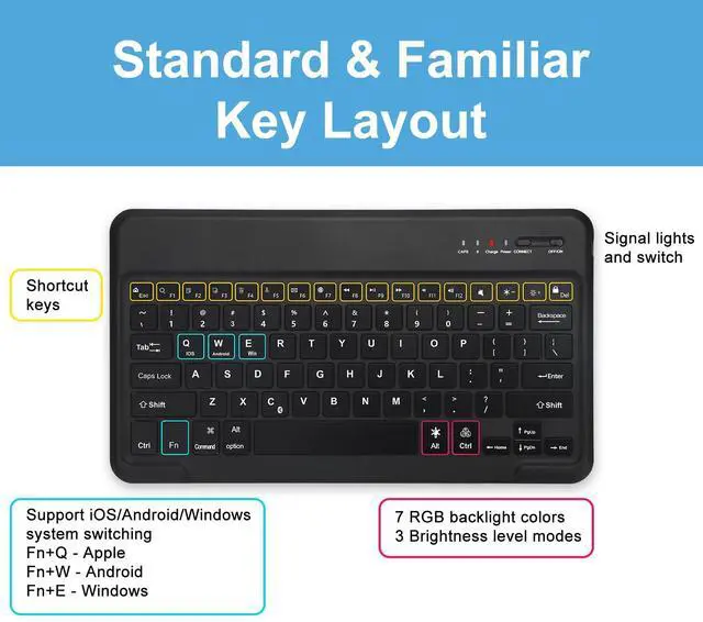 Adjustable 7-color backlight: Bluetooth keyboard has 7 colors of backlight, 3-level for opening backlit and adjusting brightness level. Soft backlight can see all the keys and improve work efficiency at night. Making typing fun.