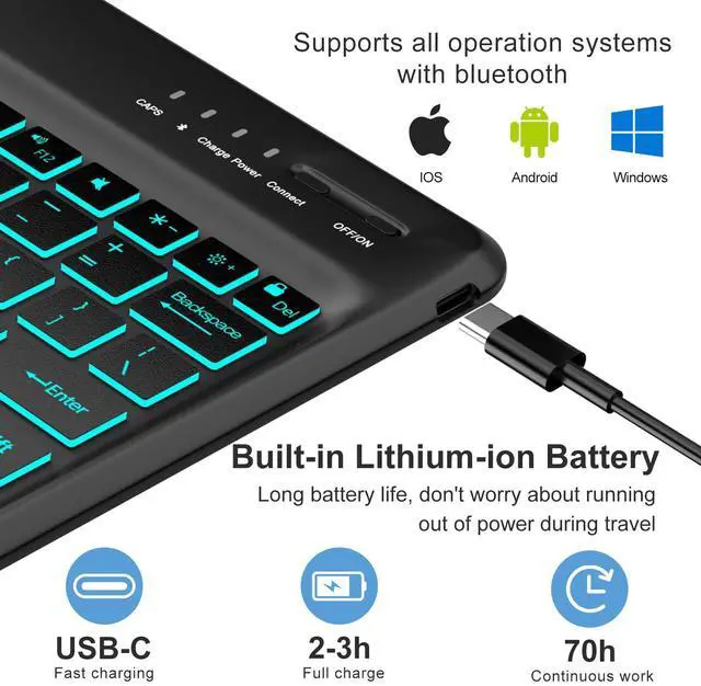Rechargeable keyboard with long battery life: Using the USB-C charging, it can be charged quickly and can be fully charged in 2.5 hours. It can be used for 70 hours on a single charge, no need to worry about running out of power when traveling, and it is easy to carry. The box contains a Type-C charging cable.