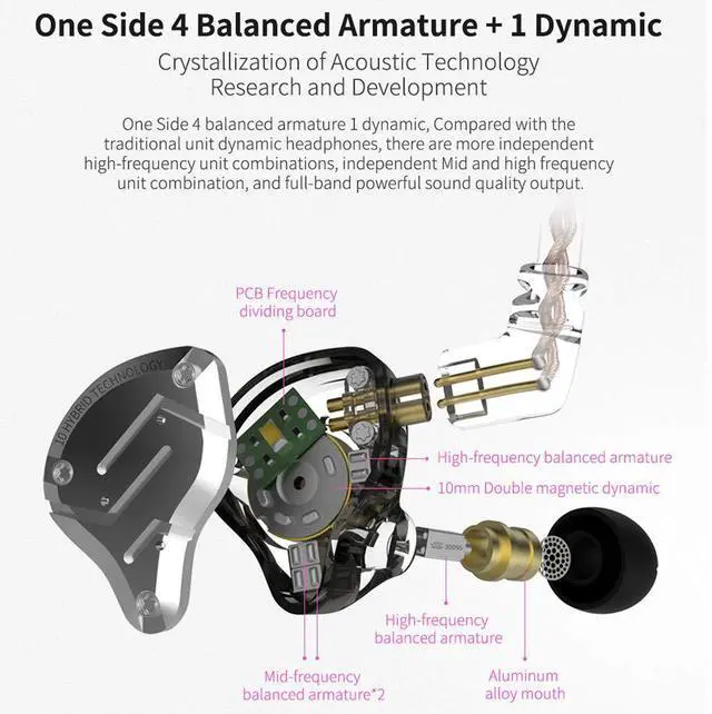 5 Drivers KZ ZS10 Pro Upgrade Version of ZS10: The KZ ZS10 Pro in ear monitor headphone has 4 balanced armature drivers and 1 piece Second Generation 10mm double magnetic dynamic driver, the bass range has improved much compared with former ZS10 model. Mid range 50060 balanced armature and 30095 high frequency armature driver bring much brighter definition on music.
