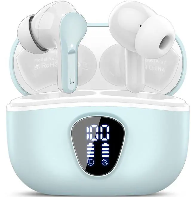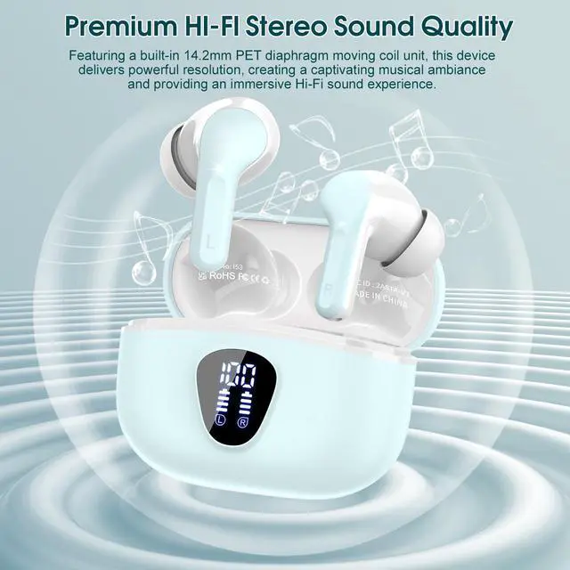 Wireless Earbuds, Bluetooth 5.4 Headphones HiFi Stereo, Bluetooth Earbuds with ENC Noise Cancelling Mic, IP7 Waterproof in Ear Earphones, 48H, LED Display Ear buds for Pad Workout Sports, Azure